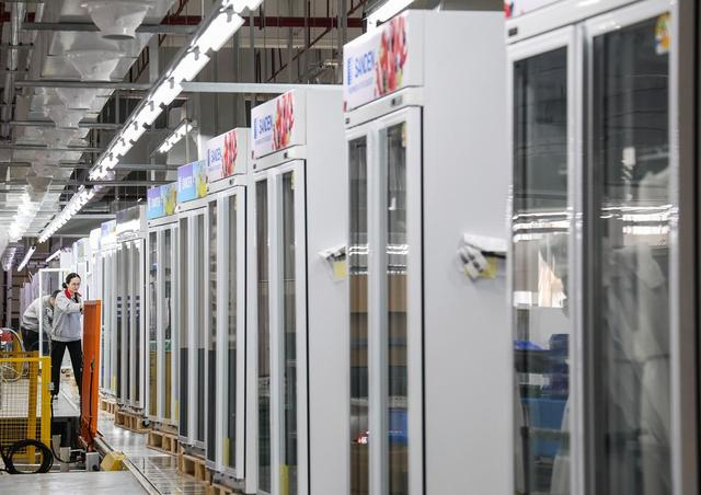 在西科冷链广东江门制造基地的产线上,工人对一批出口海外的商用冷柜进行外观检查(2025年3月22日摄)。新华社记者 刘大伟 摄