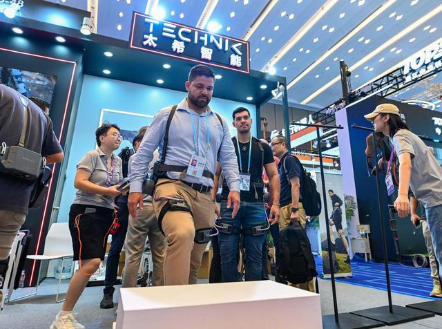 2025年10月15日,境外采购商在第138届广交会服务机器人专区太希智能展台体验登山助行外骨骼穿戴设备。新华社记者 肖恩楠 摄