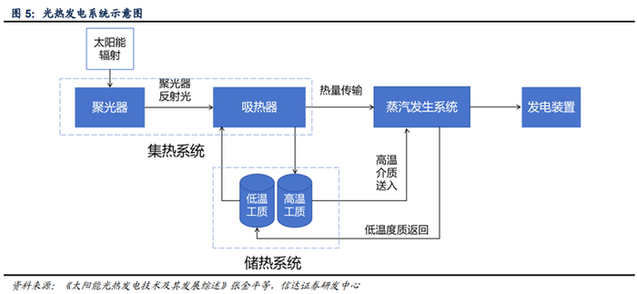 信达证券认为,光热发电兼具调峰电源和长时储能双重功能,能够有效平抑风电、光伏发电等新能源出力的波动性,是加快构建新型电力系统的重要支撑。经过多年发展,我国已成功掌握塔式、槽式、菲涅尔式等主流光热发电技术,已建成全球领先的光热发电产业链。