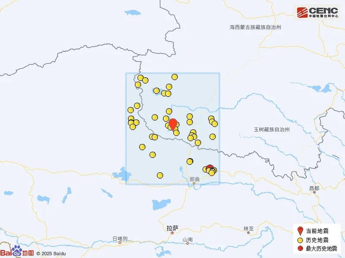 历史地震:根据中国地震台网速报目录,震中周边200公里内近5年来发生3级以上地震共86次,最大地震是2021年3月19日在西藏那曲市比如县发生的6.1级地震(距离本次震中226公里),按震级大小前50次历史地震分布如图。