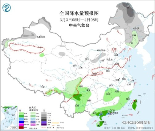 图2 全国降水量预报图(3月3日08时至4日08时)