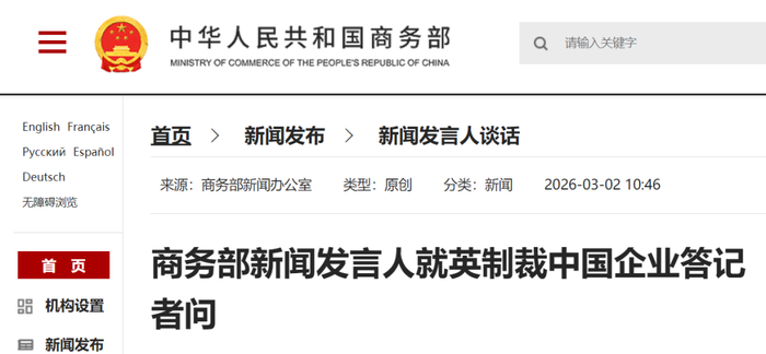 商务部新闻发言人就英制裁中国企业答记者问。