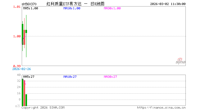 3月2日,截止午间收盘,红利质量ETF易方达(560370)跌0.10%,报1.001元,成交额1495.52万元。红利质量ETF易方达(560370)重仓股方面,贵州茅台截止午盘跌1.10%,三七互娱跌3.27%,山金国际涨1.29%,中国神华涨3.36%,中国太保跌2.03%,美的集团跌1.79%,金钼股份涨2.20%,东阿阿胶跌1.07%,亿联网络跌3.75%,梅花生物跌0.52%。