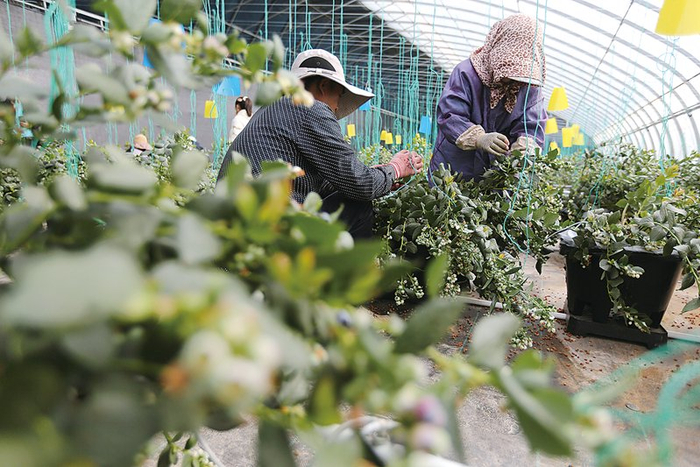 图为近日两名果农在当地蓝莓种植产业园的标准化温室大棚劳作。