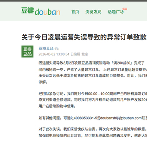新京报贝壳财经讯 3月2日,豆瓣发布《关于今日凌晨运营失误导致的异常订单致歉及退款说明》。