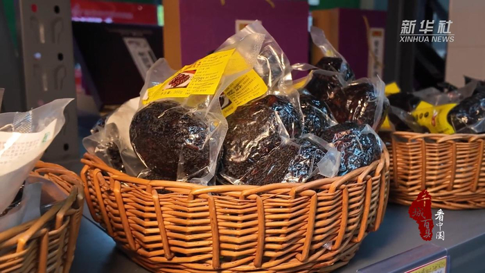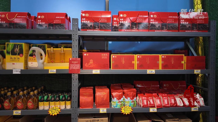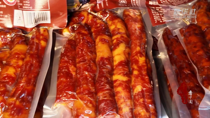 在湖南省邵阳市一处农产品出货仓里,各类产品琳琅满目,浓郁的邵阳风味扑面而来。腊肠香气四溢,猪血丸子黝黑发亮,剁椒酱红艳诱人。这些满载乡情的特色好物,即将从这里发往全国各地。