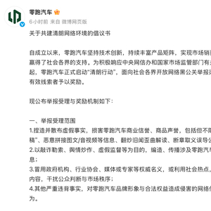 零跑汽车公布的举报受理范围包括:捏造并散布虚假事实,损害零跑汽车商业信誉、商品声誉,包括但不限于编造“黑稿”、恶意拼接图文/音视频等信息、翻炒旧闻歪曲解读、断章取义误导公众等;以敲诈勒索、舆情炒作、虚假监督等为目的,编造、传播涉及零跑汽车的不实信息;冒用政府机构、行业协会、媒体或专家等权威名义,或利用社会热点,发布误导性内容,干扰公众判断与市场秩序;其他严重违背事实,对零跑汽车品牌形象与合法权益造成侵害的网络信息内容或行为。