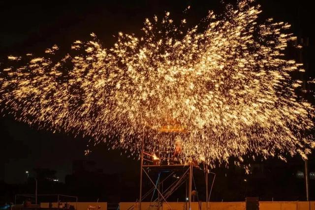 除了唯美花灯,非遗打铁花、风火轮、火壶表演轮番上演,火树银花照亮夜空,视觉效果震撼十足。