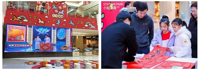 北京小站公园以“马马福福过大年”为主题,将商场中庭变为社区会客厅。巨型福字、主题展览、舞狮巡游、写春联等传统年俗活动,吸引近10万人次客流,切实满足了昌平周边居民的节日购物和休闲需求。
