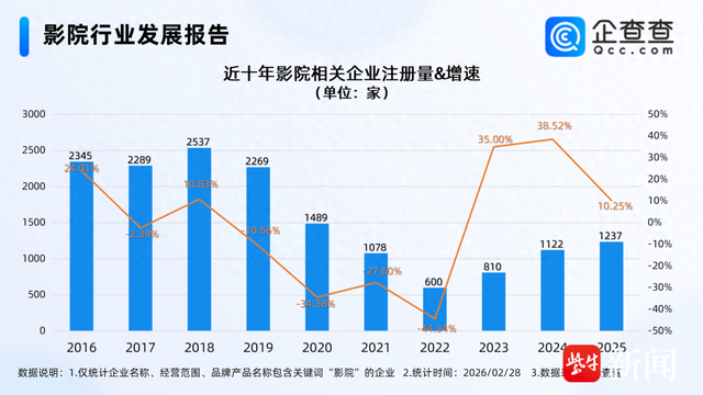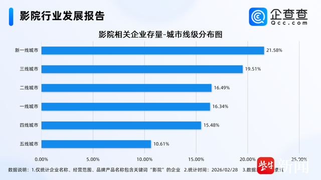 企查查数据显示,截至2月底,国内现存影院相关企业1.52万家。近十年相关企业注册量呈先减后增态势,2025年相关企业注册量同比增长10.25%至1237家。截至目前,今年已注册106家。存量方面,从注册资本分布来看,影院相关企业多为轻量级企业,注册资本在200万元以下的相关企业合计占比超六成。从城市线级分布来看,分布在新一线城市的影院相关企业最多,占比21.58%。