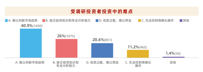 尽管我们的受调查投资者群体以成熟投资者为主,但调研显示,他们在投资实践中仍面临诸多痛点:41%的投资者坦言“难以判断市场趋势”,26%投资者认为自己“缺乏投资知识和专业分析能力”,同时,20%的投资者受到“信息过载”的困扰,在庞杂的信息中难以筛选有效内容。这一洞察要求投教服务不仅要提供知识和策略,更要成为投资者认知过程的“导航系统”和决策压力的“减压阀”,帮助他们在信息海洋中锚定方向,在不确定性中建立信心。
