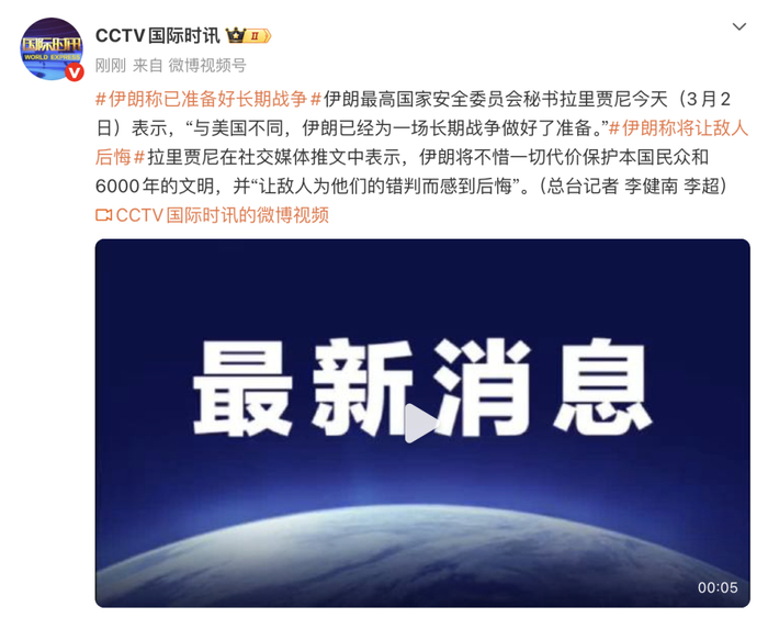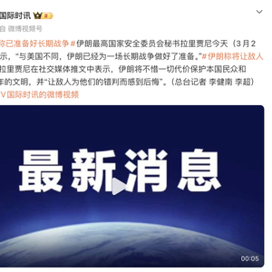 据@CCTV国际时讯,伊朗最高国家安全委员会秘书拉里贾尼今天(3月2日)表示,“与美国不同,伊朗已经为一场长期战争做好了准备。”