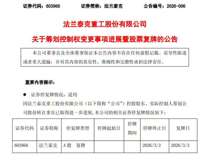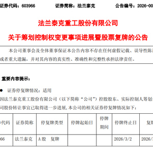 3月2日晚间,法兰泰克(603966)公告称,公司控股股东、实际控制人金红萍、陶峰华与无锡新投启航并购投资合伙企业(简称“新投启航”)签署协议,金红萍、陶峰华合计转让5838万股股份(占公司总股本的14.64%)及其对应的表决权给新投启航,同时新投启航受让金红萍持有的上海志享50%股权并增资,间接控制4685万股股份(占公司总股本的11.75%)。