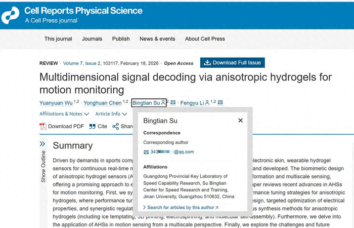 报道提到,2026年2月18日,暨南大学化学与材料科学学院李风煜教授、暨南大学体育学院苏炳添教授作为共同通讯作者(吴媛媛为论文第一作者),在 Cell 子刊 Cell Reports Physical Science 上发表了题为:Multidimensional Signal Decoding via Anisotropic Hydrogels for Motion Monitoring 的综述论文。