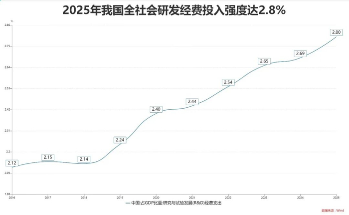 张晓强:这个发力点可以从不同角度来看。首先,要继续多渠道加大科技研发投入力度,特别是基础研究的投入力度,因为科研投入直接关系到产出。欣喜的是,根据国家统计局公布的最新数据,2025年,我国全社会研发经费投入强度达到2.8%,首次超过了OECD(经济合作与发展组织)国家平均水平。