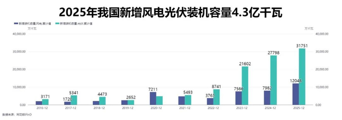 我们看到,近年来,我国风电、光伏等新能源发展得非常快。此前,国家能源局公布了最新的数据,2024年,我国一年新增的风电光伏装机合计3.6亿千瓦,2025年,这一数据达到了4.3亿千瓦。