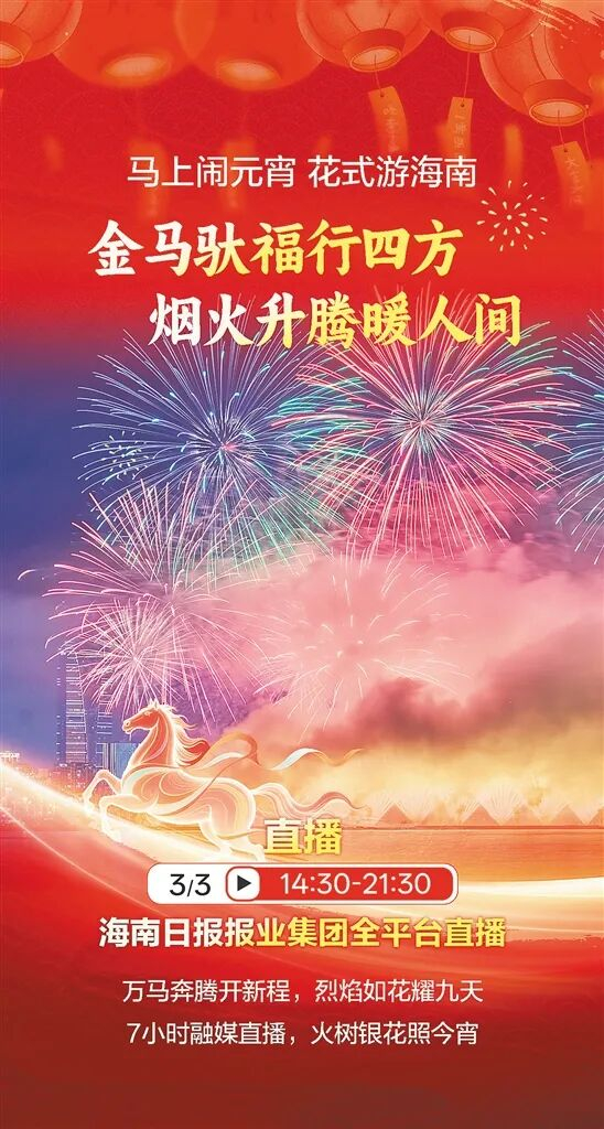 7小时直播,精彩不断档。该直播以“五骏呈祥·焕彩琼岛”为主题,创新采用“记者直击现场+舞台实录+演播室观察”三维叙事模式,全景展现海南东西南北中各地闹元宵的独特风情。值得一提的是,本次直播将邀请AI机器人、机器狗做客演播室,与主持人、国际传播官、民俗文化专家同台互动。
