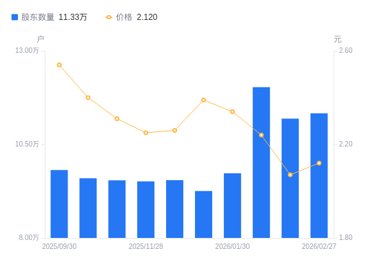 近一年(2025年2月28日至2026年2月27日),利源股份A股股东户数从13.74万户,减低至11.33万户,降幅17.56%,区间股价下跌14.52%。
