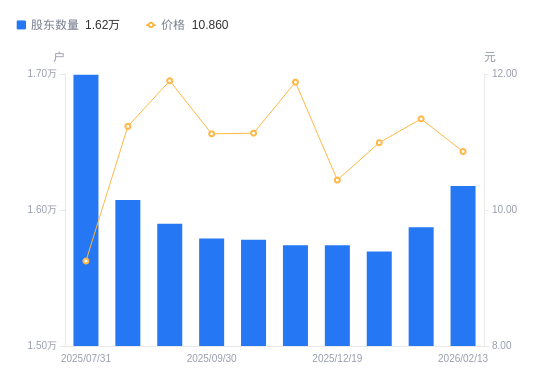 近一年(2025年2月28日至2026年2月13日),ST西发A股股东户数从1.59万户,增加至1.62万户,增幅1.82%,区间股价上涨37.64%。