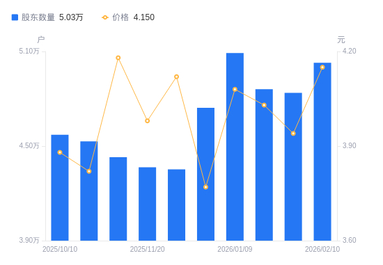 2月27日消息,数据显示,截至2026年2月10日,凯撒文化A股股东总户数为5.03万户,较上期(2026年1月30日)增加1911户,增幅3.95%。公司最新A股总股本为9.57亿股,其中流通A股9.56亿股,户均持有流通A股数量为1.9万股,较上期减少751.19股,降幅3.80%;户均持流通A股市值7.89万元,较上期增加1033.25元,增幅1.33%。