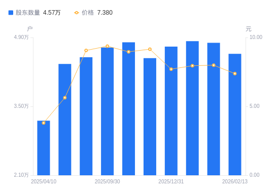 近一年(2025年2月20日至2026年2月13日),天沃科技A股股东户数从3.27万户,增加至4.57万户,增幅39.76%,区间股价上涨82.67%。