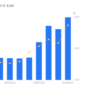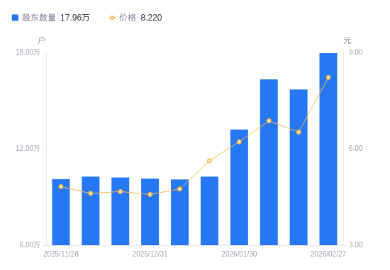 近一年(2025年2月28日至2026年2月27日),南网能源A股股东户数从11.56万户,增加至17.96万户,增幅55.38%,区间股价上涨89.71%。