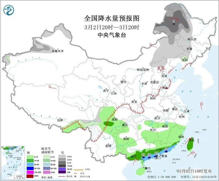 2日20时至3日20时,新疆北部、西藏东南部、内蒙古东部、东北地区西部、华北北部等地部分地区有小到中雪或雨夹雪,其中,内蒙古东北部、黑龙江西部等地部分地区有大雪;西藏东南部、川西高原、重庆西部、云南东部、贵州西部、江南中南部、华南南部有小到中雨,其中福建东南部、广东南部、广西东南部等地部分地区有大雨,局地暴雨。