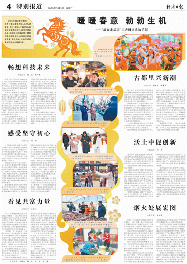 2026年农历春节期间,经济日报记者赴湖北、北京、黑龙江、四川、浙江、广西等地,围绕激发消费新活力、培育发展新动能、增进民生新福祉等主题展开蹲点调研采访,在浓浓的新春氛围里,深入报道、生动呈现我国经济社会发展新气象。
