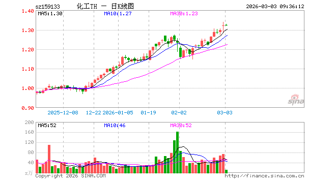 3月3日,化工ETF天弘(159133)开盘涨0.15%,报1.322元。化工ETF天弘(159133)重仓股方面,万华化学开盘涨0.72%,盐湖股份跌1.18%,天赐材料涨0.00%,巨化股份涨0.00%,藏格矿业跌1.05%,多氟多跌0.38%,云天化跌1.45%,恒力石化涨0.11%,华鲁恒升涨1.53%,宝丰能源涨2.74%。