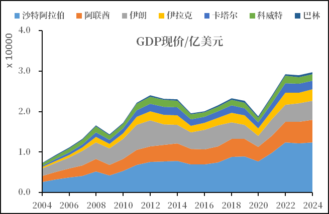 海合会国家人均 GDP 长期位居全球前列。伊朗、伊拉克受制裁与战乱影响,人均水平相对较低。