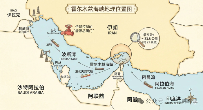 霍尔木兹海峡以内的波斯湾地区主要包括沙特、阿联酋、伊朗、伊拉克、卡塔尔、科威特和巴林七个国家,其中伊朗位于波斯湾东北岸,是唯一非阿拉伯国家,控制霍尔木兹海峡北岸。除伊朗和伊拉克外,其余 5五国均为海合会成员国,该地区石油储量占全球近半,天然气储量占全球约三分之一,是世界最重要的油气产区与出口地。唯一出海口为霍尔木兹海峡,全球约 20% 的石油运输必经此地。