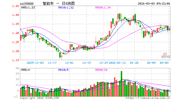 3月3日,智能汽车ETF华夏(159888)开盘跌0.23%,报1.311元。智能汽车ETF华夏(159888)重仓股方面,拓普集团开盘跌0.09%,豪威集团跌0.21%,科大讯飞涨0.50%,比亚迪跌0.41%,长安汽车涨2.21%,赛力斯跌0.43%,芯原股份涨0.60%,立讯精密涨0.10%,北京君正涨0.54%,德赛西威涨0.60%。