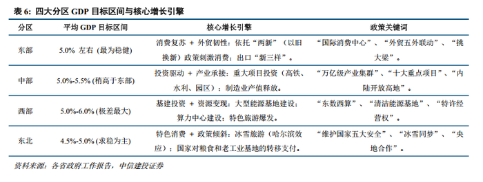 中部地区消费目标略高于投资目标(4.8% vs 4.2%),显示出由投资驱动向内需扩展过渡的趋势。虽然制造业基础仍是重要支撑,但区域结构已开始强化消费对增长的贡献,尤其在人口基数较大的省份,消费升级成为增长重要补充动力。