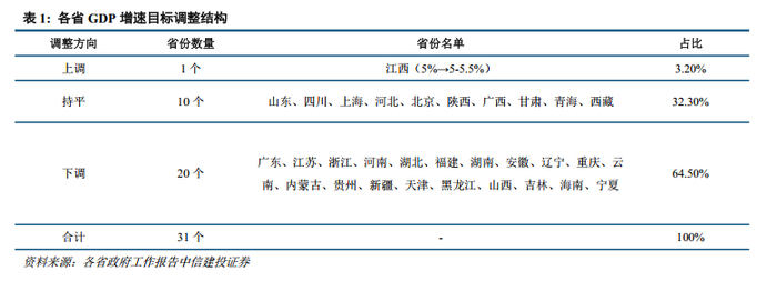 结构上看,2026年地方两会GDP目标加权平均值为5.03%,多数省份目标下调或区间化,体现务实审慎取向。21个省市下调目标,9个省市持平,仅江西上调。
