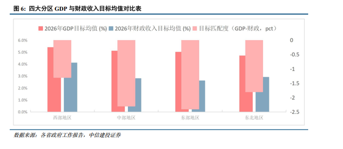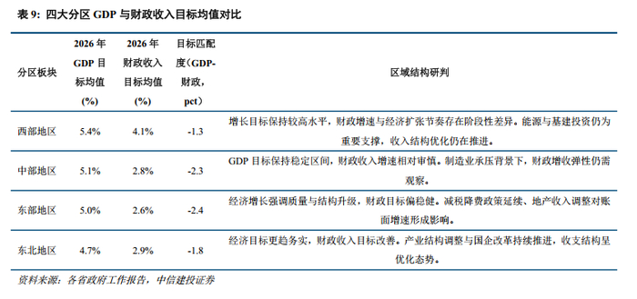 根据四大分区GDP与财政收入目标均值对比表,四大分区均呈现出GDP增速目标高于财政收入增速目标的结构性特征,但差异程度不同。西部地区2026年GDP目标均值为5.4%,财政收入目标均值为4.1%,两者差值约-1.3个百分点。虽然存在一定“剪刀差”,但幅度相对温和。结合区域发展特征来看,西部增长仍以能源、基建与战略项目为主要支撑,财政收入结构优化仍在推进阶段,收入弹性尚未完全释放。这种结构意味着增长扩张与财政修复之间仍需时间匹配。