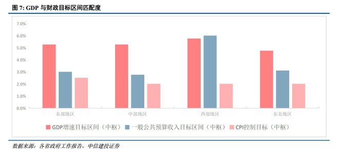 中部地区GDP目标均值为5.1%,财政收入目标均值仅为2.8%,差值达到-2.3个百分点。GDP设定保持稳定区间,但财政目标明显审慎,反映出在制造业利润承压与地产收入回落背景下,地方财政对收入弹性保持谨慎预期。中部作为制造业承接与内需支撑区域,其增长质量与税基修复节奏高度相关,财政匹配度的提升有赖于产业盈利能力改善。