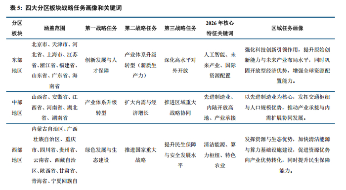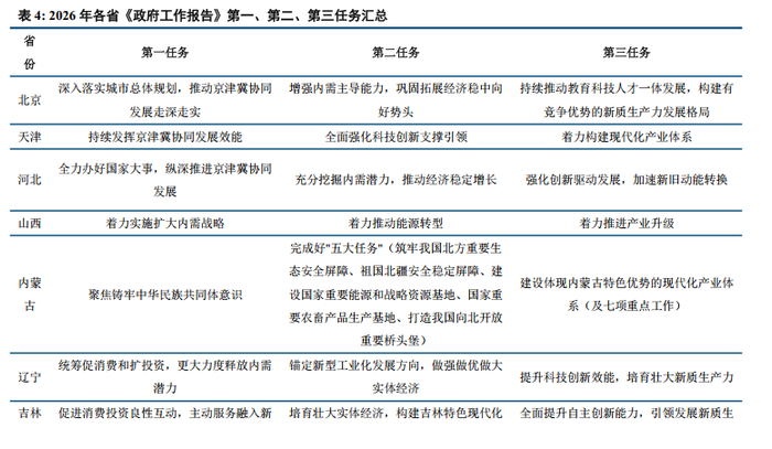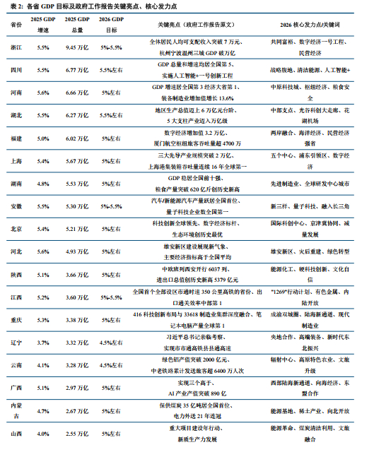 区域层面,四大经济板块发展各有侧重,形成功能互补的梯度结构:东部地区目标围绕5%左右,以消费扩容和创新驱动为核心;中部地区目标维持在5%-5.5%,突出制造业承接与内循环枢纽功能;西部地区目标相对偏高,以基建投资和资源转化为支撑;东北地区目标在4.5%-5%之间,更侧重内需修复与特色产业突破(如冰雪经济、粮食安全),呈现“修复型”增长特征。总体而言,2026年地方两会的经济工作逻辑已从总量扩张转向功能分工与结构优化。目标设定更加务实,工作重点更加聚焦,通过区域间的差异化布局和协同,为“十四五”圆满收官与“十五五”稳健开局夯实了兼具韧性与质量的基础。