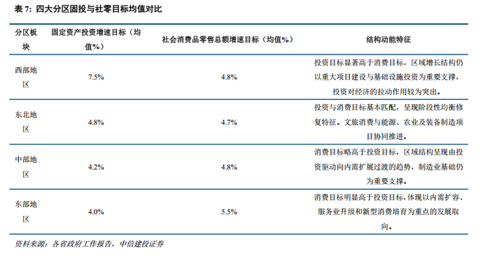 进一步结合四大分区固投与社零目标均值对比表,可以观察到投资与消费在区域增长结构中的权重差异。