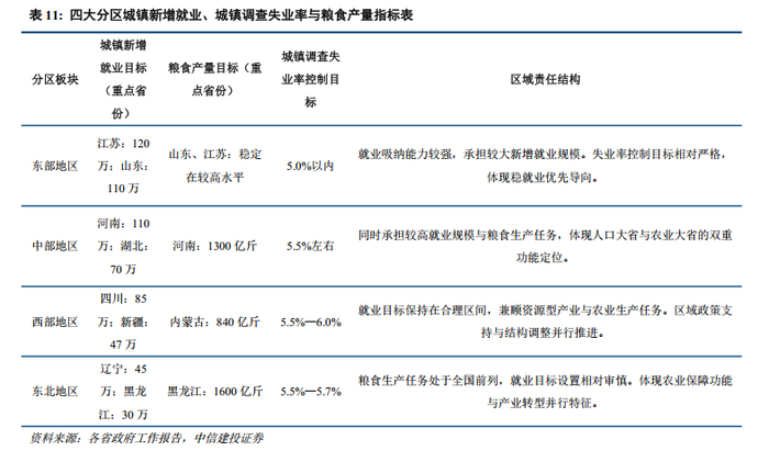 在财政约束环境下,民生与安全底线成为检验地方增长责任的重要维度。根据四大分区就业与粮食底线指标表,可以从就业、粮食生产与失业率控制三个方面观察区域责任结构。