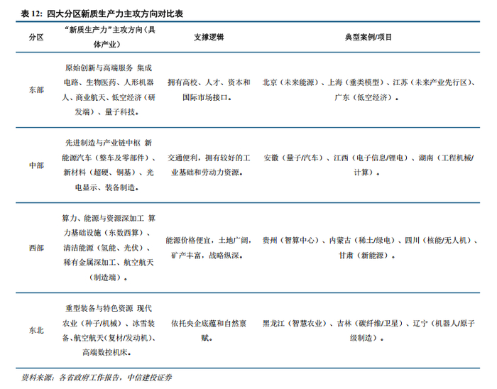 根据四大分区新质生产力主攻方向对比表,四大分区在新质生产力布局上呈现出“研发端—制造端—算力端—资源端”的分化格局。