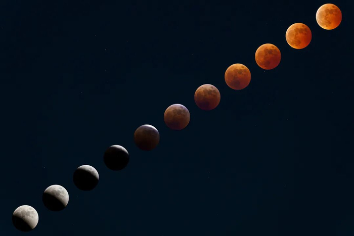 可尝试将红月亮与城市地标同框,或拍摄“糖葫芦串像”记录月食全过程,通过延时摄影记录月全食全过程,或对食甚、生光等关键阶段特写,定格红月亮与蓝带细节,可轻松拍出氛围感大片。