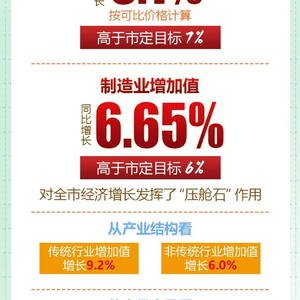 去年,全市规模以上工业增加值比上年增长8.1%,全省排名第三,高于市定目标7%;制造业增加值同比增长6.65%,高于市定目标6%,对全市经济增长发挥了“压舱石”作用。从产业结构看,传统行业增加值增长9.2%,非传统行业增加值增长6.0%;从产品产量看,全市重点监测的26种工业产品中有15种产品产量同比实现增长,增长面为57.7%;从行业看,全市36个行业大类中有23个行业增加值保持同比增长,增长面为63.9%;从工业新动能看,规上装备制造业增加值增长11.0%;工业战略性新兴产业中,新一代信息技术产业增加值增长1.3倍,新材料产业增长10.1%;高技术制造业中,计算机及办公设备制造业增加值增长68.3%,电子及通信设备制造业增长59.9%。
