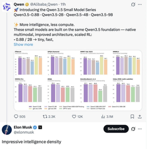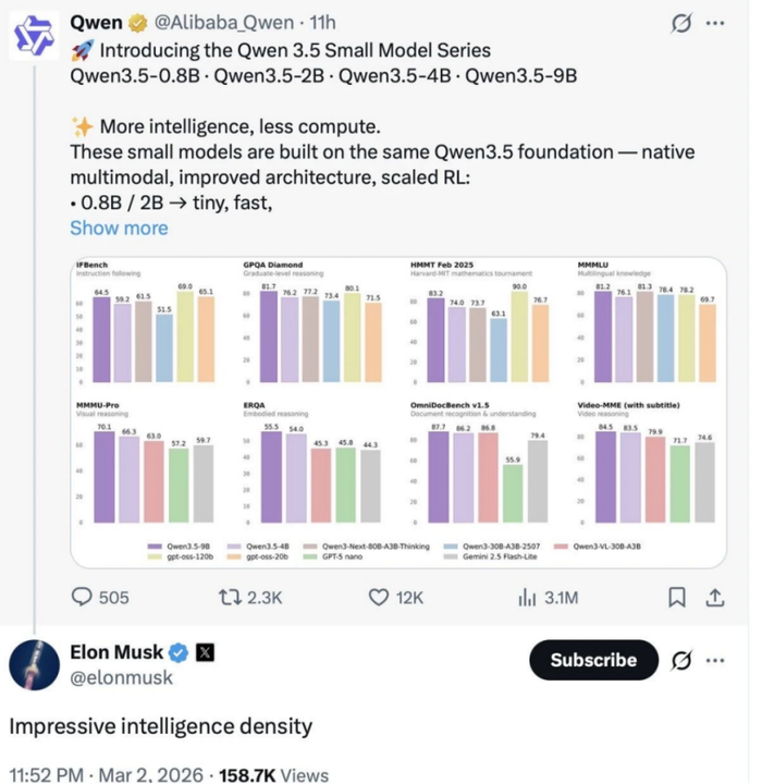 随后,美国企业家埃隆·马斯克(Elon Musk)在其社交媒体上评价这批模型,具备“令人印象深刻的智能密度(Impressive intelligence density)”。