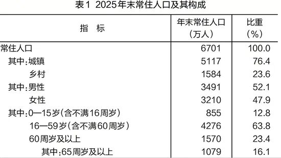 据2025年1%人口抽样调查数据推算,年末全省常住人口6701万人,比上年末增加31万人,其中城镇常住人口5117万人。男性人口3491万人,女性人口3210万人,分别占总人口的52.1%和47.9%。全年出生人口35.8万人,出生率为5.35‰;死亡人口43.7万人,死亡率为6.54‰;自然增长率为-1.18‰。