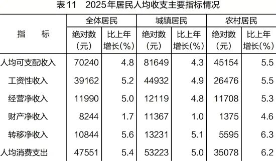 全年全体居民人均消费支出47551元,比上年增长5.4%,扣除价格因素实际增长5.4%。按常住地分,城镇居民人均消费支出53223元,增长5.0%,扣除价格因素实际增长5.0%;农村居民人均消费支出35078元,增长6.2%,扣除价格因素实际增长6.4%。