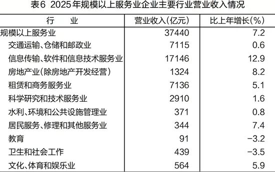 [5]规模以上服务业统计范围包括:年营业收入2000万元及以上的交通运输、仓储和邮政业,信息传输、软件和信息技术服务业,水利、环境和公共设施管理业,卫生行业法人单位;年营业收入1000万元及以上的房地产业(不含房地产开发经营),租赁和商务服务业,科学研究和技术服务业,教育行业法人单位;以及年营业收入500万元及以上的居民服务、修理和其他服务业,文化、体育和娱乐业,社会工作行业法人单位。