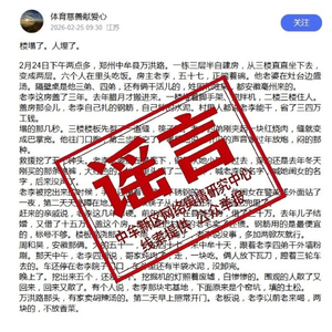 2026年2月25日9时30分,网络账号“体育慈善献爱心”发布图文信息称“2月24日下午两点多,郑州中牟县万洪路一栋三层半自建房倒塌,多人被埋”等内容。经核查,该信息为网络谣言,相关内容纯属虚构。(来源:网信郑州)
