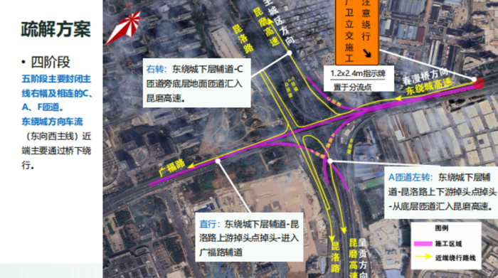 A匝道封闭施工期间,需要从经开区前往昆明市区的车辆,需要提前从右侧车道进入广卫立交底层右转前往昆玉高速昆明方向入口进入昆玉高速。