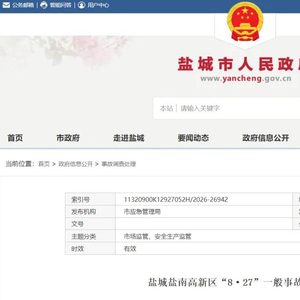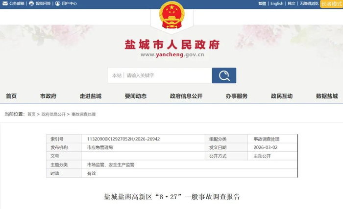 3月2日,盐城市应急管理局发布《盐城盐南高新区“8·27”一般事故调查报告》。