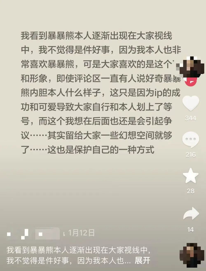 有人表示:“我喜欢的是暴暴熊这个熊偶,不是皮下的人,露脸之后,感觉原本的可爱被打破了。”还有人吐槽:“本来是看熊解压,结果现在全是真人直播,越来越像普通网红。”